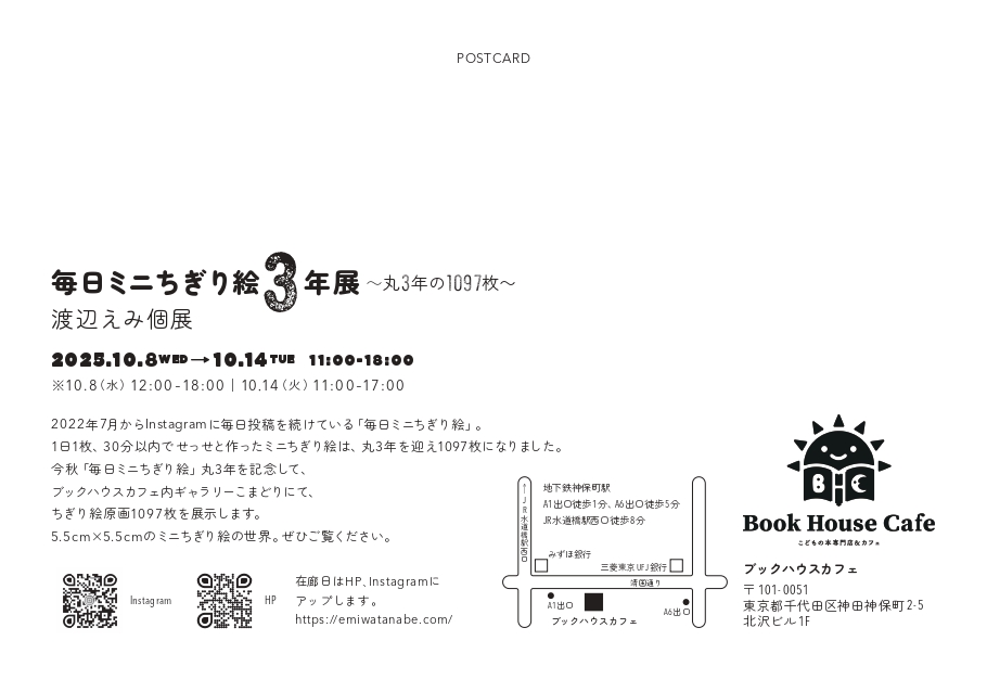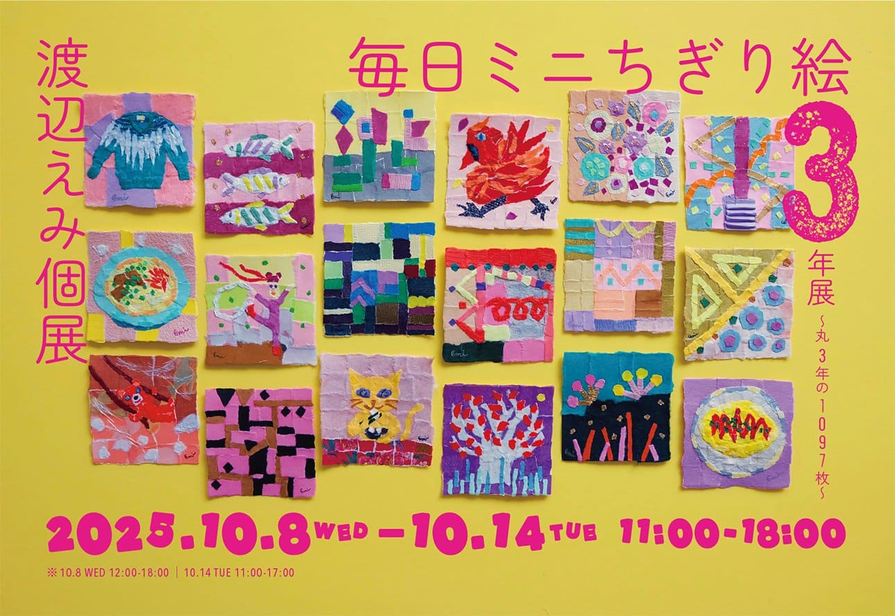 今秋「毎日ミニちぎり絵」3周年を記念して、ブックハウスカフェ内ギャラリーこまどりにて、ちぎり絵原画1097枚を展示します。
